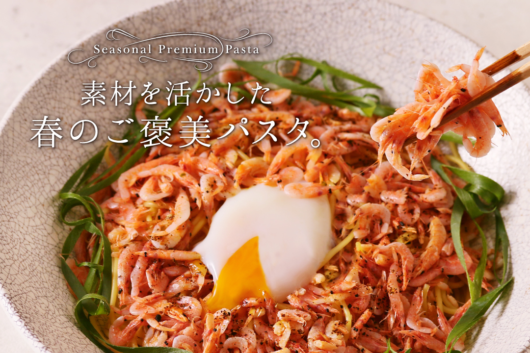 いつも頑張っている自分に、たまには美味しいご褒美を! 春限定メニューには、釜揚げ桜海老、いくらを贅沢に使用した、 春らしく色鮮やかな2品のご褒美パスタをご用意しました。